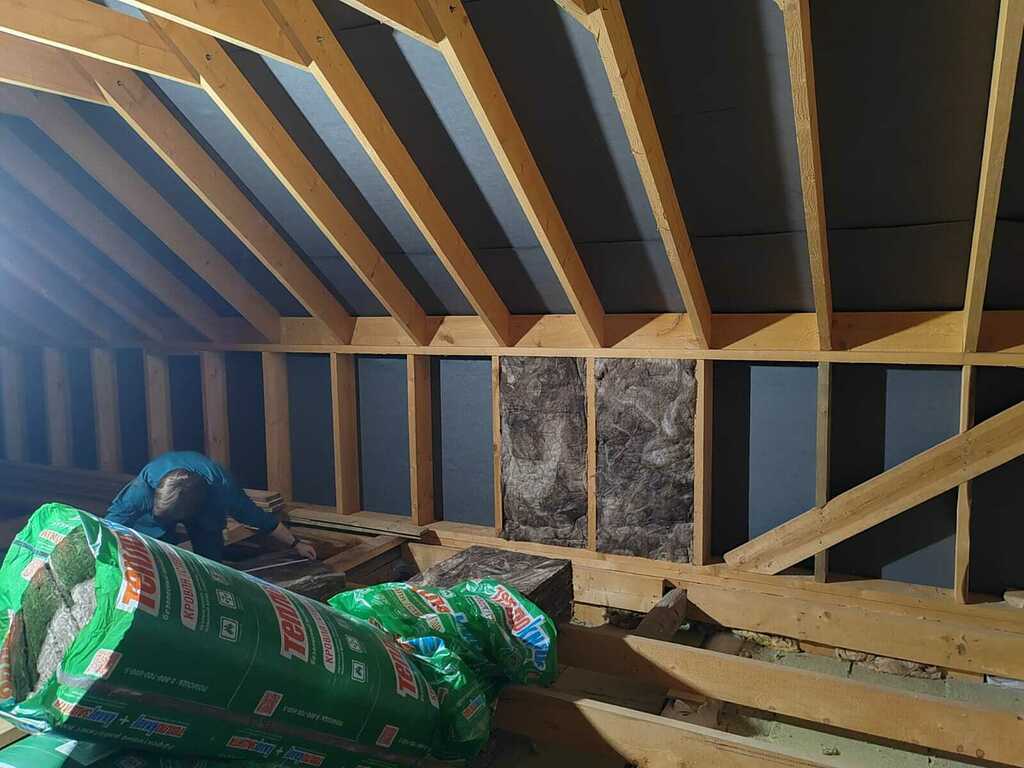 • Далее следует монтаж нижнего карниза стен, который выступает в качестве опоры для теплоизоляционного материала. Он выравнивает утеплитель, защищает его от непогоды и насекомых.